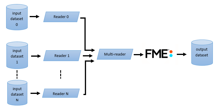FME uses the Multi-Reader to combine several datasets, possibly of different types and different coordinate systems, into one logical input dataset.