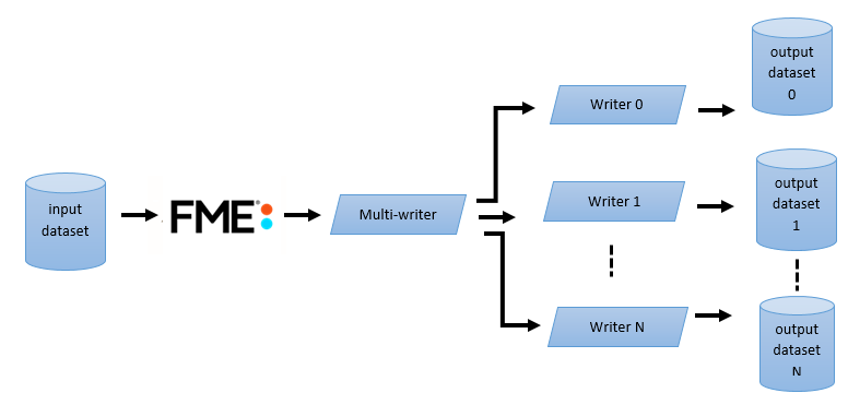 FME uses the Multi-Writer to create several different output datasets, possibly of different types and different coordinate systems, during one FME run.