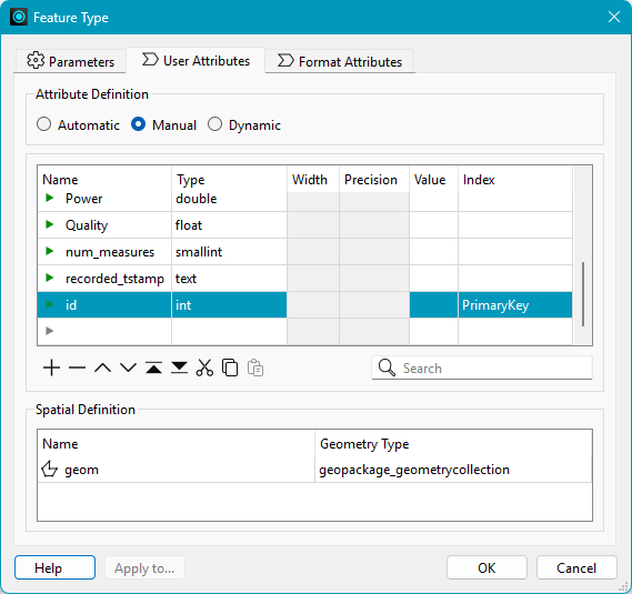 The parameters in this section take effect only when FME creates a spatial table (a GeoPackage features table).