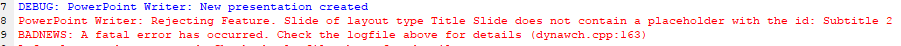 However, in some cases, the PowerPoint writer returns an error message indicating that a required slide layout or placeholder ID is missing. For example: