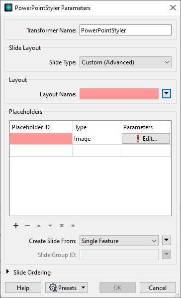 The PowerPointStyler transformer parameters (shown below) allow you to specify content for as many placeholders as you like, and multiple features can write content to the same slide when given the same Slide Group ID. (Note that, although there are different PowerPoint placeholder types for different types of content, FME can place any supported content in any type of placeholder.)
