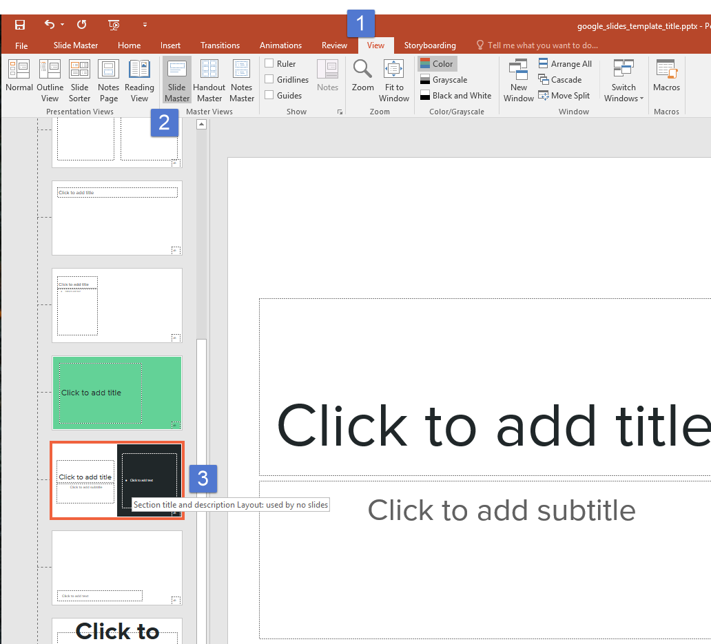 Open the PowerPoint template and select the View tab. |