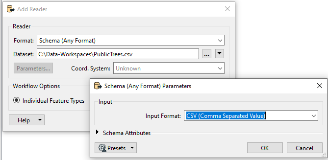 The Schema (Any Format) Schema reader reads the schema using the underlying reader, whose name is given by the Input Format workspace Navigator parameter.