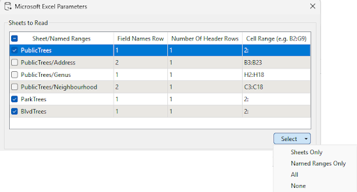 By default, all worksheets and named ranges are selected. You can use the Select button in the Sheets to Read section to filter the display: