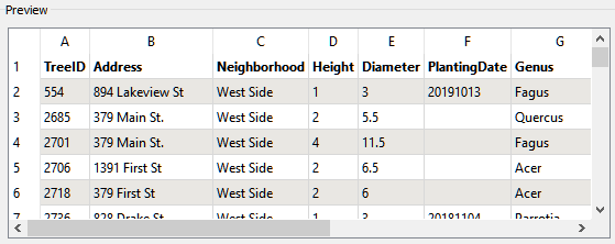 This section shows a preview of the data (up to 100 rows) of the selected feature type (either feature or named range). As shown in the example here, if you select a header row from the Sheets to Read area, that row will be shown in boldface text.