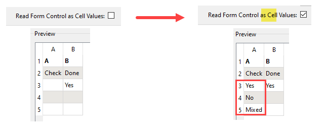 After the file is read, the Reader Parameters Preview area shows the cells before and after Read Form Control as Cell Values is checked:
