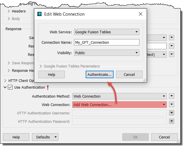 For example, in an HTTPCaller transformer parameters dialog, check Use Authentication. In the Authentication Method field, specify Web Connection. In the Web Connection field, specify the connection.