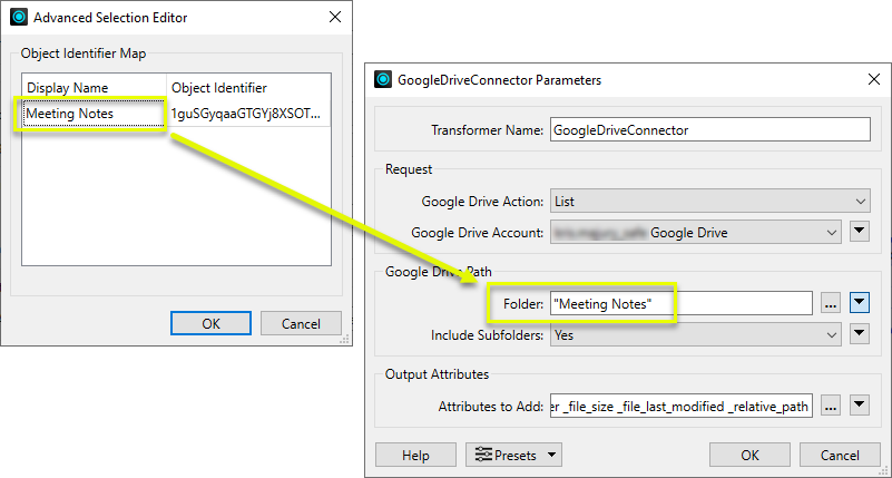 In this GoogleDriveConnector example, Meet Recordings was selected for the Folder parameter: