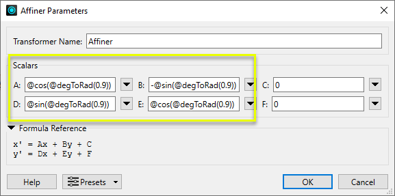 In the parameters dialog, we enter the scalars to rotate the features by 0.9 degrees.