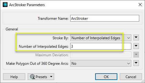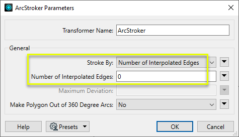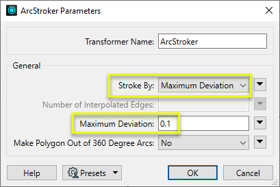 When Stroke By is Maximum Deviation, specify the maximum distance in ground units that new geometry may be from the original arc. If the this value is greater than the primary or secondary axis of the arc or ellipse, the stroked arc will have the minimum number of edges possible. If less than or equal to 0, the value of Workspace Parameters > Spatial > Stroking Tolerance is used. If that value is also less than or equal to 0, the transformer will use Number of Interpolated Edges > zero (0) instead. |