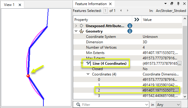 The output feature, shown in blue over the original arc in yellow, is a line with 23 coordinates. Note that it tightly follows the original arc, and coordinate 4 is highlighted.