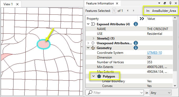 When Build Internal Edges (Advanced) is Yes, one area is created using all segments to form a continuous boundary with internal edges.