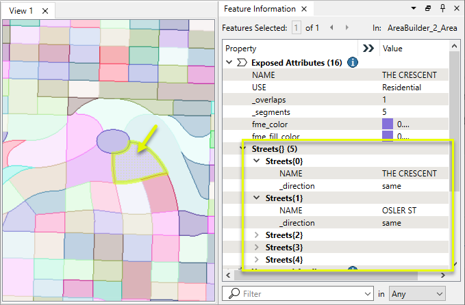 A list attribute named Streets is added which will contain the name of all surrounding streets for each output area, as well as the line segment orientation.
