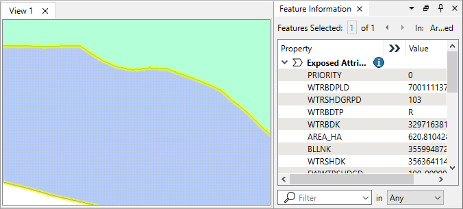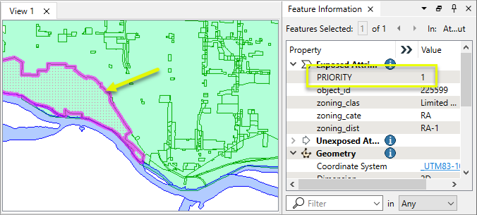In this example, we have two datasets with area geometry - zoning polygons and two-line rivers. Note that the selected zone polygon has a PRIORITY value of 1.