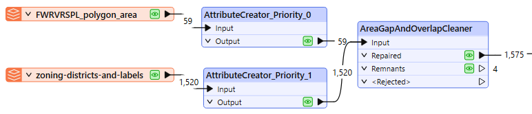 Both datasets are routed into AttributeCreators to add their PRIORITY value, and then on to an AreaGapAndOverlapCleaner.
