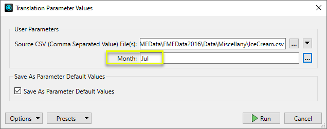 To extract the sales numbers for any given month, we create a simple workspace that contains a User Parameter called Month. It has been configured as a Choice parameter, and the possible Month values provided. Upon running the workspace (with Prompt), the user selects the month “Jul”, which becomes the current value assigned to the Month parameter.