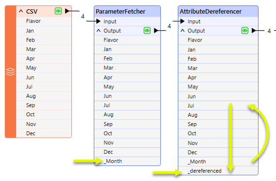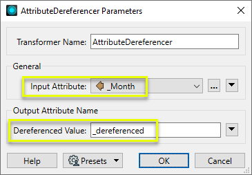 Then, in the AttributeDereferencer, the Input Attribute is _Month, and the newly created attributeDereferenced Value has the default name _dereferenced.