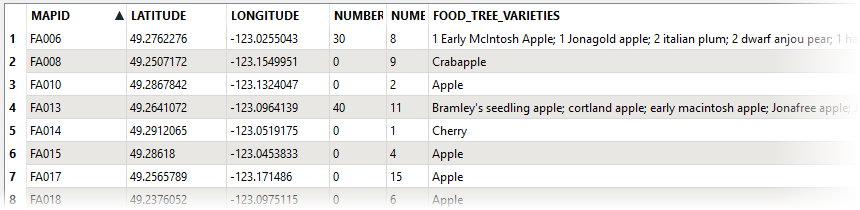 In this example, we have a dataset of food trees. For each location, there may be any number of individual trees, and the names of the varieties are stored in the FOOD_TREE_VARIETIES attribute. The names of the varieties are separated by semicolons - “;”.