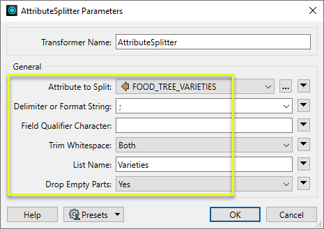 In the parameters dialog, we select the name of the attribute and define how the split should be done. Delimiter or Format String is set to ; (semicolon), any whitespace will be trimmed, any empty parts will be dropped, and the new list attribute is named Varieties.