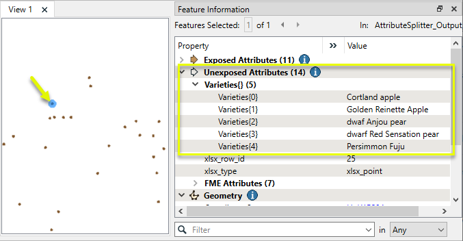 Viewing the results in the FME Data Inspector, the FOOD_TREE_VARIETIES attribute has been split into its component parts, and the parts have been added as individual elements to the new list attribute.