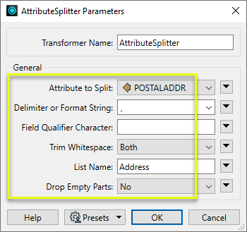 In the parameters dialog, the Delimiter is set to comma (,), we will trim whitespace, and create a new list attribute called Address. Note that Drop Empty Parts is set to No - if part of an address is missing, dropping it would cause the other parts to end up in the wrong list element.