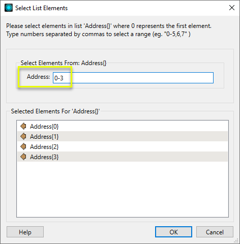 List elements are numbered starting with zero (0). In the Select List Elements dialog, entering the range 0-3 will expose the four total list elements that make up the address.