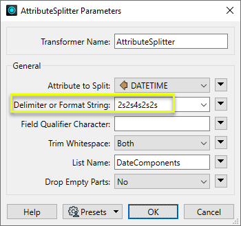 Once connected to an input feature stream, the AttributeSplitter lets you select an Attribute to Split. The value for that attribute is divided into parts based on parameter selections, and the results added to a new list attribute.
