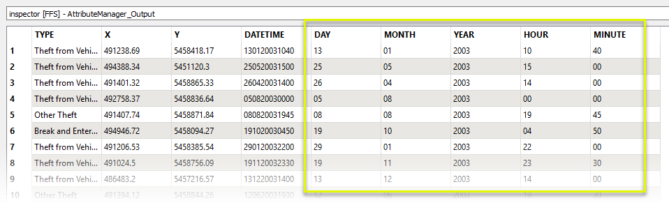 In this example, we have a dataset of crime incidents. The DATETIME attribute contains a string composed of date and time information, which we want to split into its component parts.