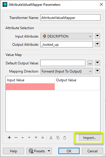 The Value Map can either be created manually or by importing any FME-supported dataset. Importing is particularly useful for using a predefined map that already contains the Input and Output Values (such as a spreadsheet), and for scanning a dataset to find all existing values for a given attribute.