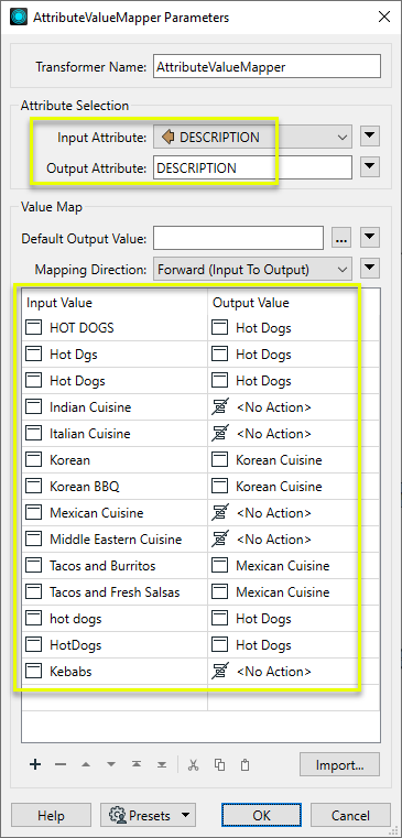 Note that the Output Attribute is the same as the Input Attribute. This will result in the new values overwriting the original values (except for those denoted as <No Action>).