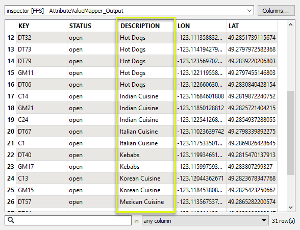 In this example, we have a dataset of food vendors, in which the DESCRIPTION attribute values have a number of errors and style differences such as capitalization. There are also some values that we want to combine into broader categories.