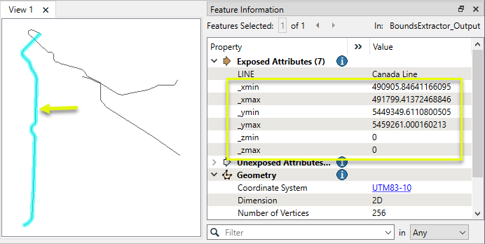 In this example, we have a set of transit line features and wish to extract their bounds as attribute values.