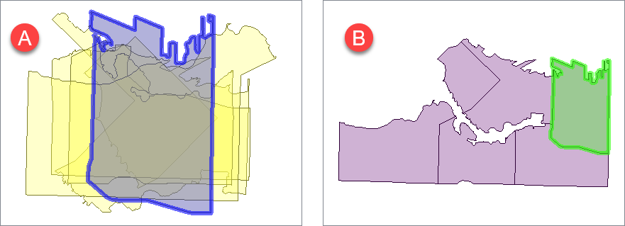 The Reprojector can also reproject features to local coordinate systems, however, each feature is handled individually and receives its own coordinate system based on its bounding box. An example using neighborhood polygons is shown below (A). Each feature’s origin is at its center, and so they appear stacked on top of each other.