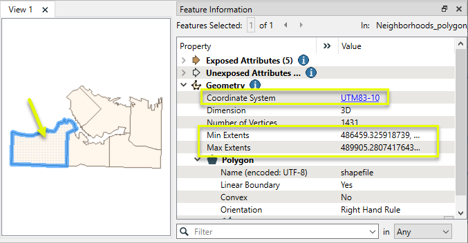 In this example, we have a set of neighborhood polygons, in a UTM coordinate system. Note that the extents are appropriate coordinates.