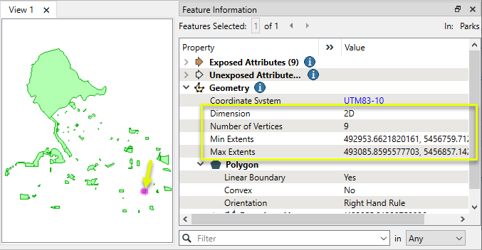 In this example, we have a shapefile of parks, and want to extract their coordinates into an attribute. Note that they are in a UTM coordinate system, with ground units in meters.
