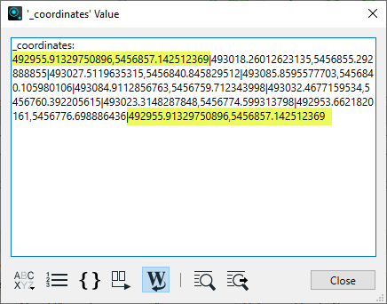 On closer examination of the attribute value, we see the coordinates of the polygon, separated by pipe delimiters. Note that the first and last coordinate are identical - indicating a closed area.