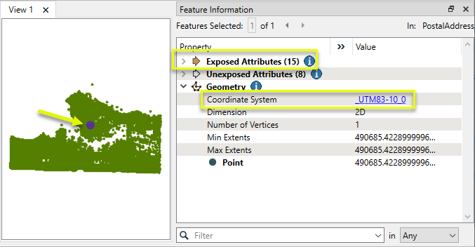 In this example, we have a geodatabase containing address points. Note that the point features have 15 exposed attributes, and are in a UTM coordinate system. We want to extract the coordinates of each point into attributes for use elsewhere.