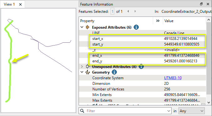 The features are routed through two CoordinateExtractors, one to extract the first point and one to extract the last.