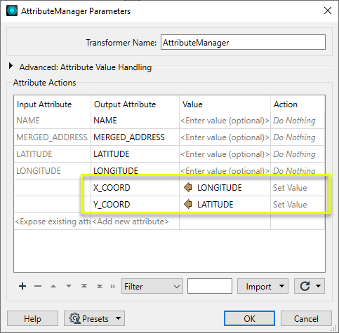 In the parameters dialog of the AttributeManager, we add the two new attributes X_COORD and Y_COORD, and copy the values from LONGITUDE and LATITUDE.