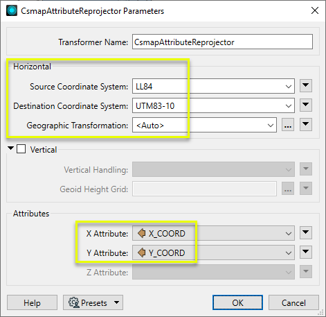 In the parameters dialog of the CsmapAttributeReprojector, we set the Source and Destination Coordinate Systems to LL84 and UTM83-10, respectively. Geographic Transformation is left as default, <Auto>.