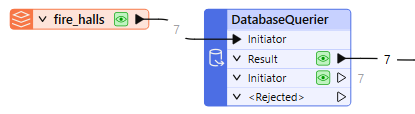 The fire_halls dataset is connected to the Initiator port on a DatabaseQuerier. Each fire_halls feature will cause the query to be executed, for that feature.