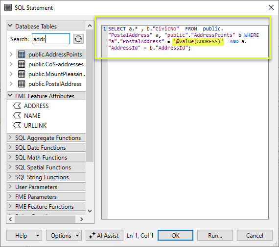 - The PostalAddress table is being joined to the feature using PostalAddress field.