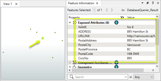 The features with query results are output via the Result port, and have new attributes added by the query.
