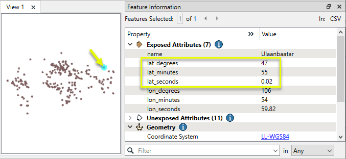 In this example, we have a dataset of world cities, with latitude and longitude coordinates stored as attributes, in degrees, minutes, and seconds.