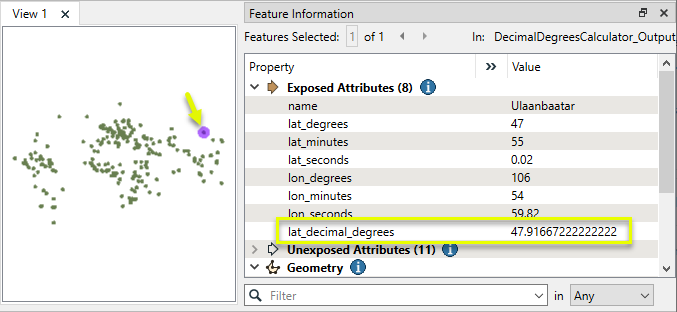 The output features now have a lat_decimal_degrees attribute, containing the calculated decimal degree value.
