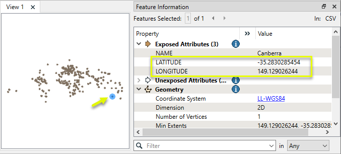 In this example, we have a dataset of world cities. The features have decimal degree coordinates as attributes. We want to convert those values to DMS.