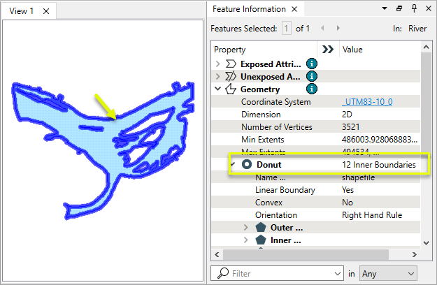 In this example, we have a donut polygon representing a portion of a major river. Note the numerous holes where islands lie.