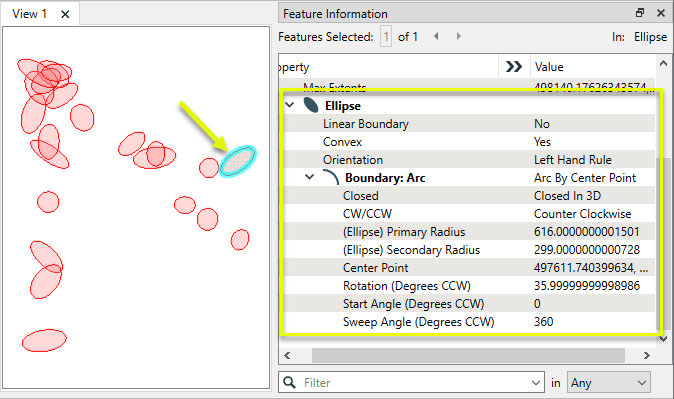 Features without valid ellipse or point geometry are output via this port, as well as points that do not have the required parameter values to create an ellipse.
