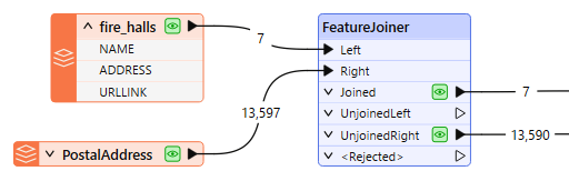In this example, we have a small dataset of Fire Halls, which have a street address, but do not have a complete postal address. The FeatureJoiner will perform a join to a dataset of addresses, and merge those attributes on to the Fire Halls.