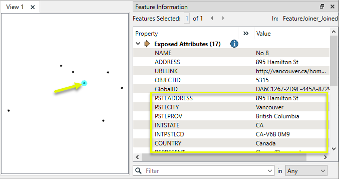Viewing the results from the Joined output port, you can see that the attributes from the postal address features have been added to the Fire Halls.